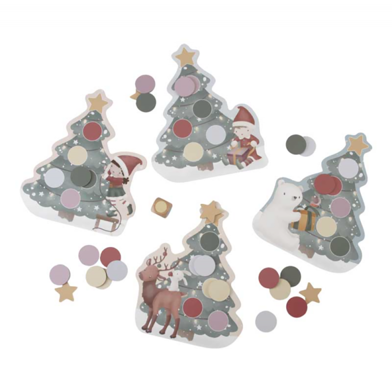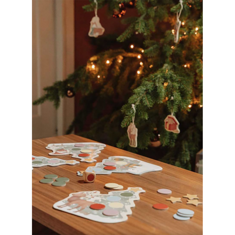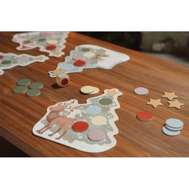 Цветът и шарката отстрани на зара съответстват на подходящ орнамент за коледно дърво, който след това може да бъде поставен върху картичката с коледно дърво.