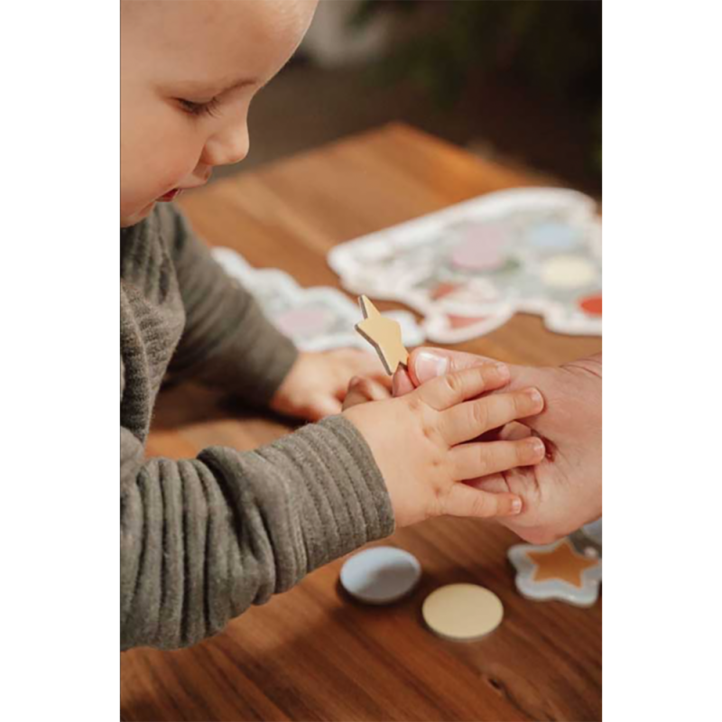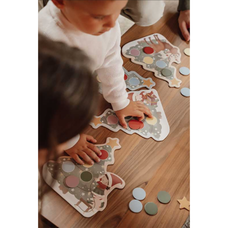 Всяко дете получава картичка за елха с мостра от 5 цветни коледни украси и звезда.