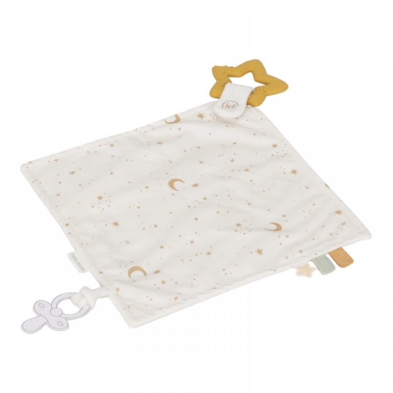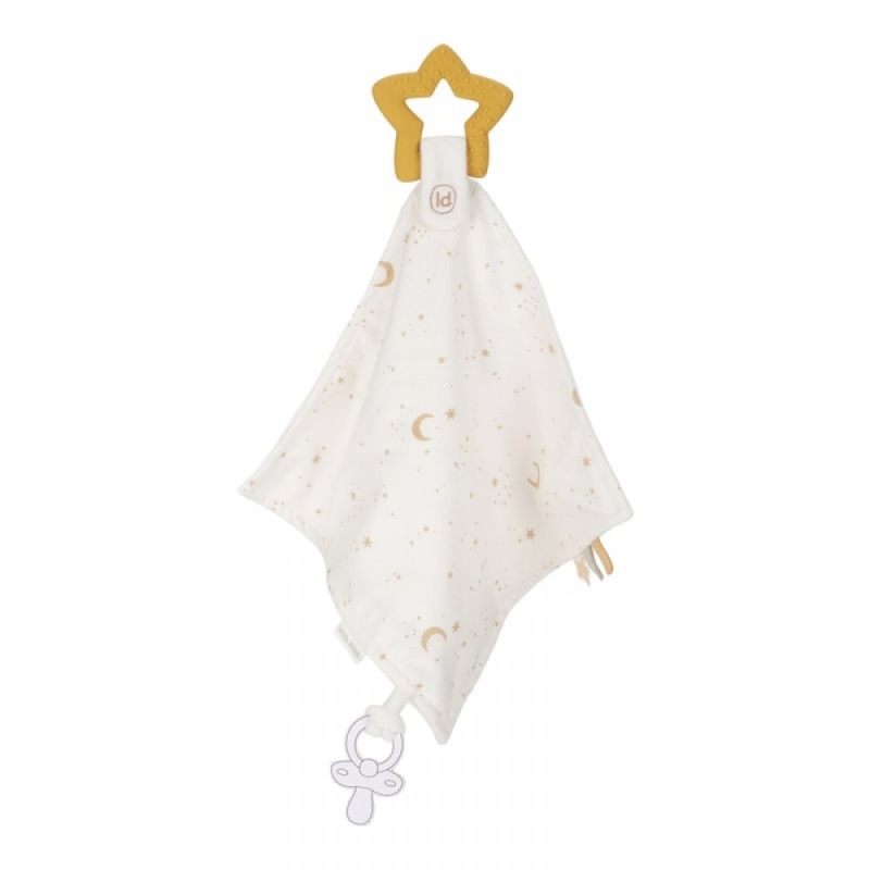 Тази очарователна кърпа за гушкане с гризалка е създадена, за да дари бебето с уют, спокойствие и нежност още от първите дни. Меката плюшена текстура осигурява усещане за сигурност, докато гризалката във формата на звезда предлага приятно облекчение по време на никнене на зъбки. С добавени малки цветни етикетчета за изследване, това е идеалният първи приятел за всяко новородено. Дизайнът в натурални нюанси се вписва перфектно във всяка стилна бебешка стая или количка. Лека, удобна и изключително практична – тя ще бъде до бебето във всеки момент на гушкане.