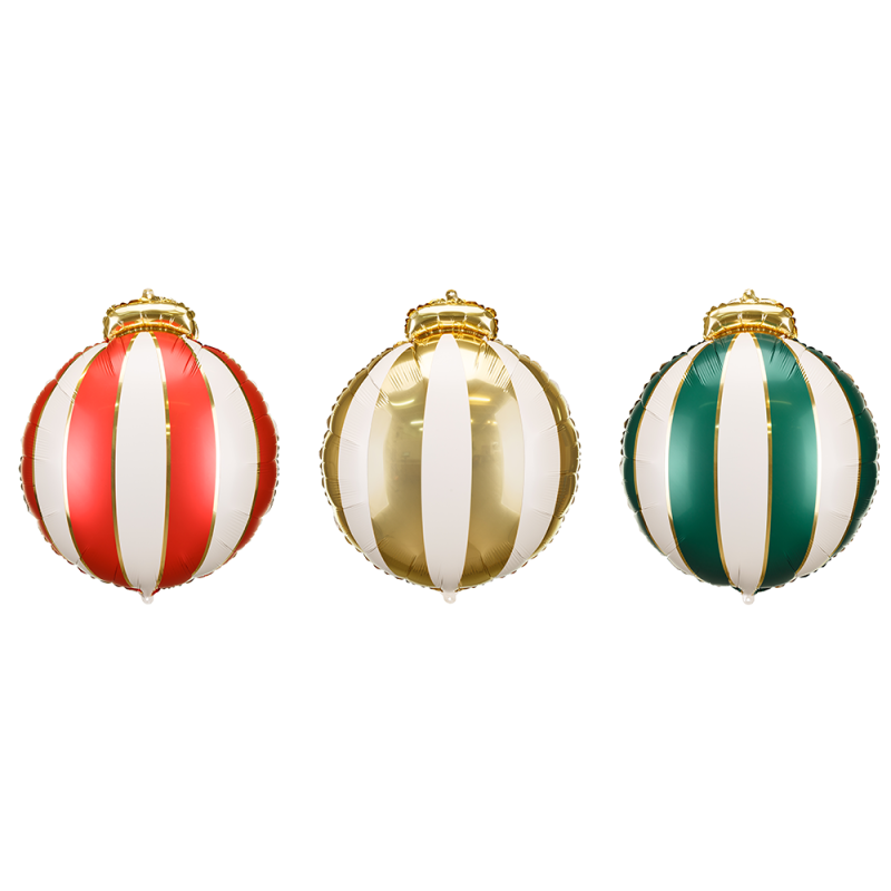 Впечатляващи фолиеви топки в класическата празнична комбинация от червено, зелено, бяло и злато. Големият им обем и елегантните вертикални линии ги правят идеален акцент за фотокът, празничен ъгъл, около елхата или като част от красива композиция с подаръци.