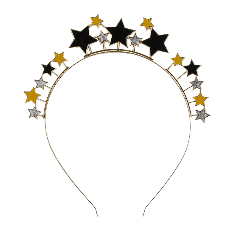 Добавете блясък и стил към всяко празнично изживяване с елегантната диадема Звезди. Миксът от златни, черни и сребърни звездички създава впечатляващ силует и превръща този аксесоар в перфектен избор за рожден ден, Нова година, фотосесии и тематични партита.