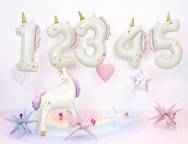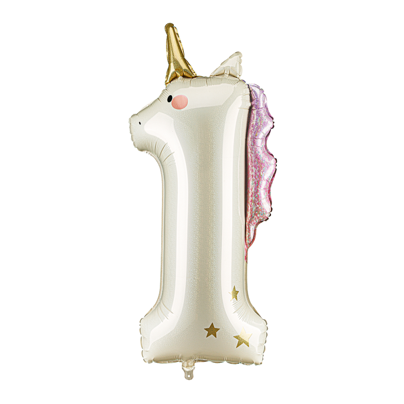 Фолиев балон във формата на цифра 1 с дизайн на еднорог, подходящ за декорация на първи рожден ден. Балонът е в кремав цвят с холограмен ефект и фини светлорозови и златни детайли. Може да се използва самостоятелно или като част от балонна композиция или фотокът.