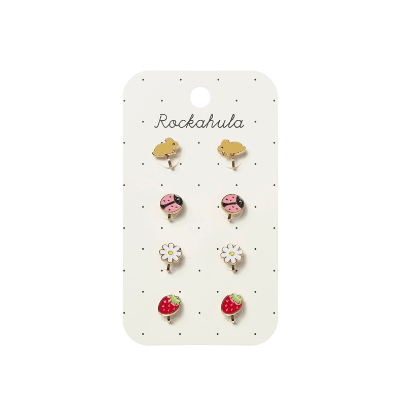 Комплектът включва четири любими детски мотива – зайче, калинка, маргаритка и ягода, които превръщат всяка визия в малка приказка.