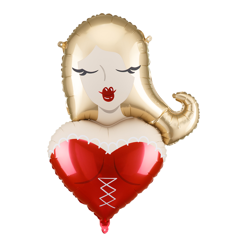 Този фолиев балон с форма на момиче е създаден да бъде акцент – женствен, закачлив и с ясно присъствие. Кремавите нюанси, златистата коса и червеното сърце с корсетен детайл носят настроение, характер и леко намигване, без да прекрачват границата.