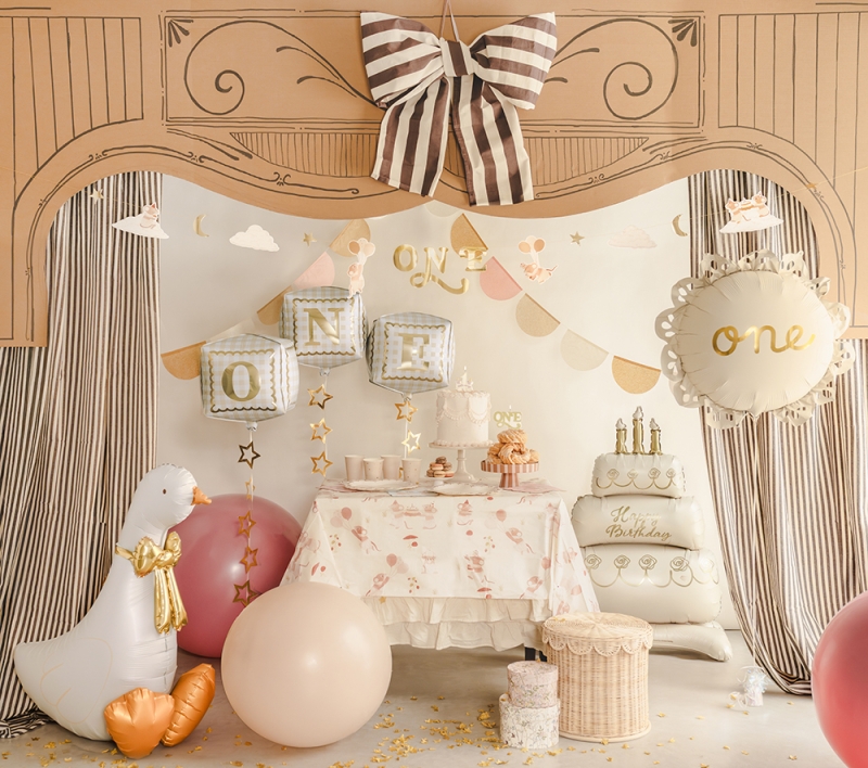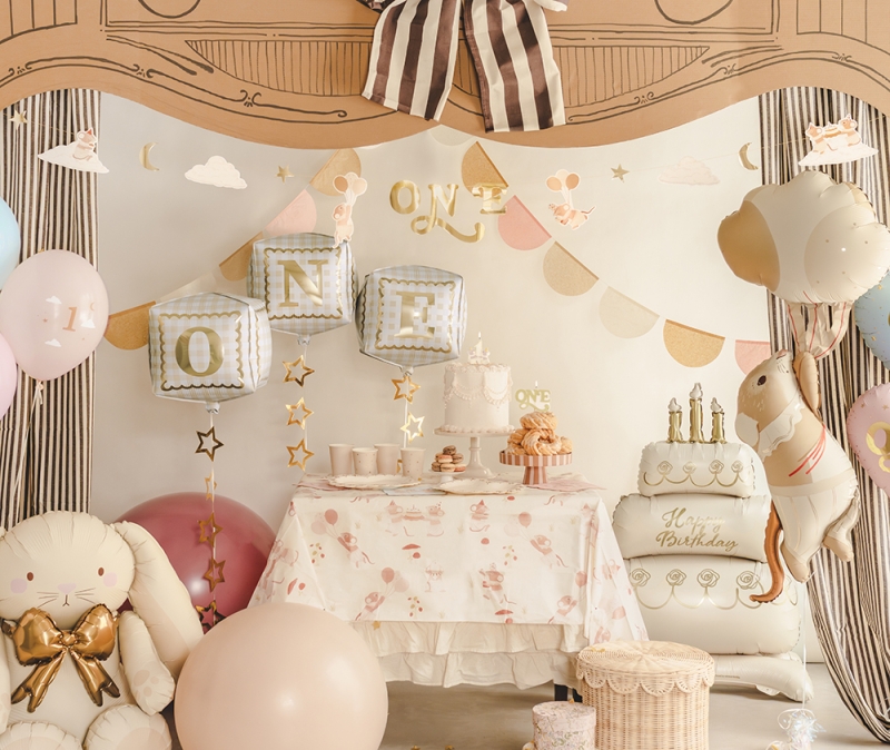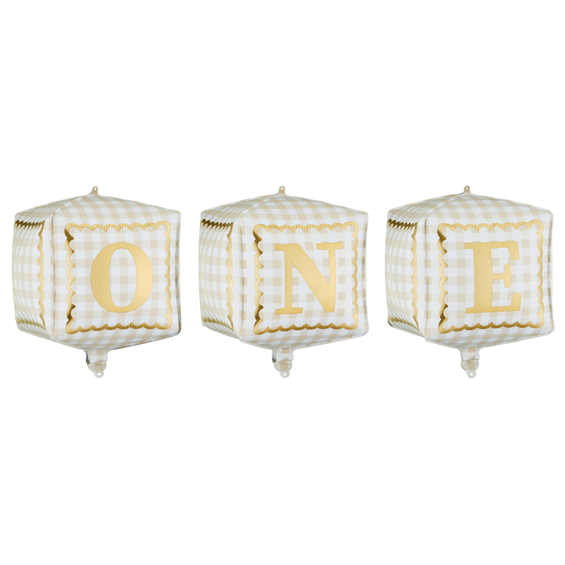 Сет от три фолиеви балона във формата на кубчета, които изписват думата ONE и превръщат декора за първия рожден ден в стилен, модерен акцент. Обемната им форма създава усещане за подреден и завършен празничен фон и успешно замества класическия банер.