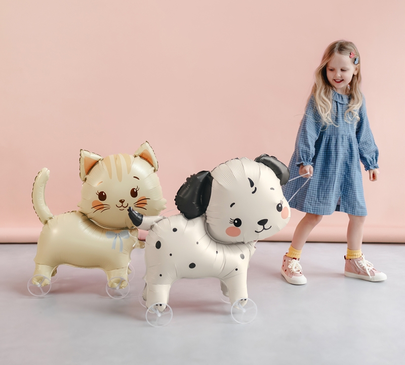 Този балон коте на колела се надува с въздух и се движи лесно благодарение на прикрепените прозрачни колелца. С помощта на включената лента може да бъде дърпан, което го превръща не просто в декорация, а в забавна част от празника.