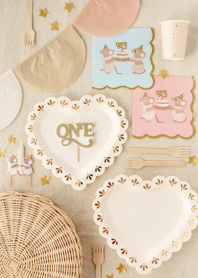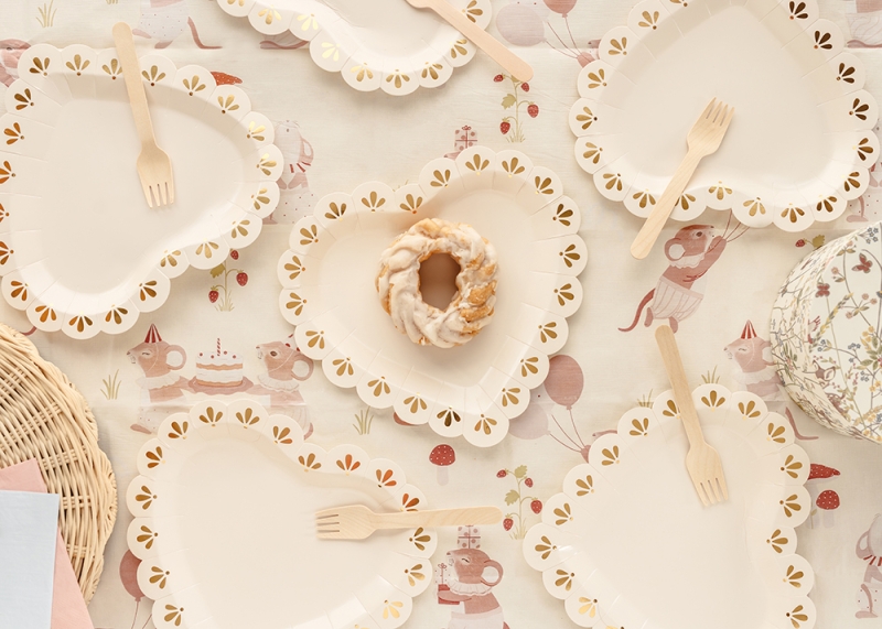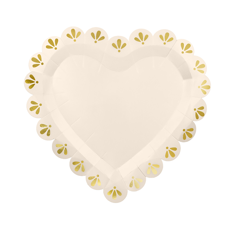Тези хартиени чинии сърце създават усещане за подредена и стилна празнична маса още с първия поглед. Формата им е мека и отличаваща се, а комбинацията от кремаво и златно добавя фин акцент без излишна натовареност.