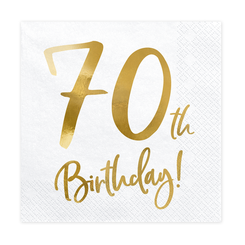 Допълнете празничната визия с тези стилни салфетки за 70-ти рожден ден, които внасят елегантен завършек на всяка маса. С класическата комбинация от бяло и златен надпис 70th Birthday, те създават усещане за празник с изискан характер.