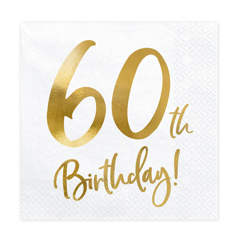 Допълнете празничната атмосфера с тези елегантни салфетки за 60-ти рожден ден, които придават стилен и завършен вид на всяка парти маса. С класическа комбинация от бяло и златен надпис 60th Birthday, те са перфектният детайл за изискан юбилей.
