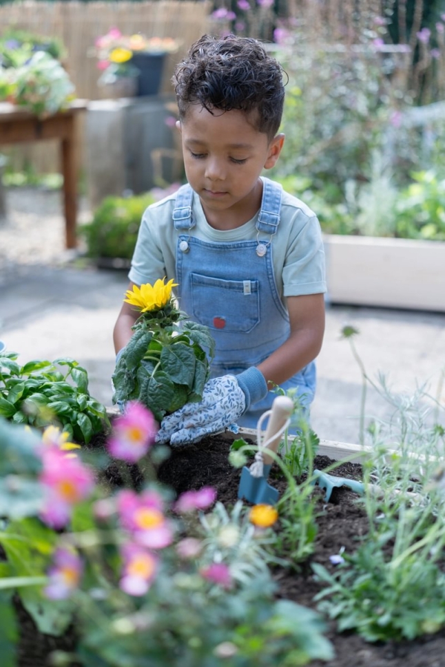 Горският принт в свежи сини тонове ги превръща в любим аксесоар за всяко дете, което обича да помага в градината.